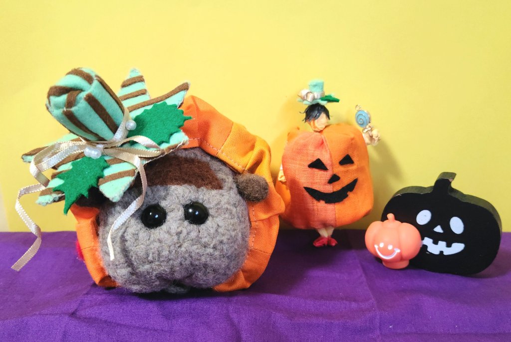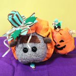 テディと畜生さんのハロウィン衣装を縫いました☺仲良くカボチャです🎃 今回も、以前作った折り紙畜生さんに服を着せています✂️ テディはすっかりパーティ気分…🎵 #モルカー #モルカーファンアート #PUIPUIハロウィン
