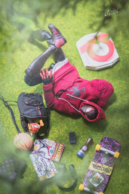 レゴで作った「マイルズ・モラレス」くんのサイズ感がわかりやすいように指に座らせて撮影してみました。高さ約9センチです。 #LEGO #MilesMorales #Spiderman #minifigure