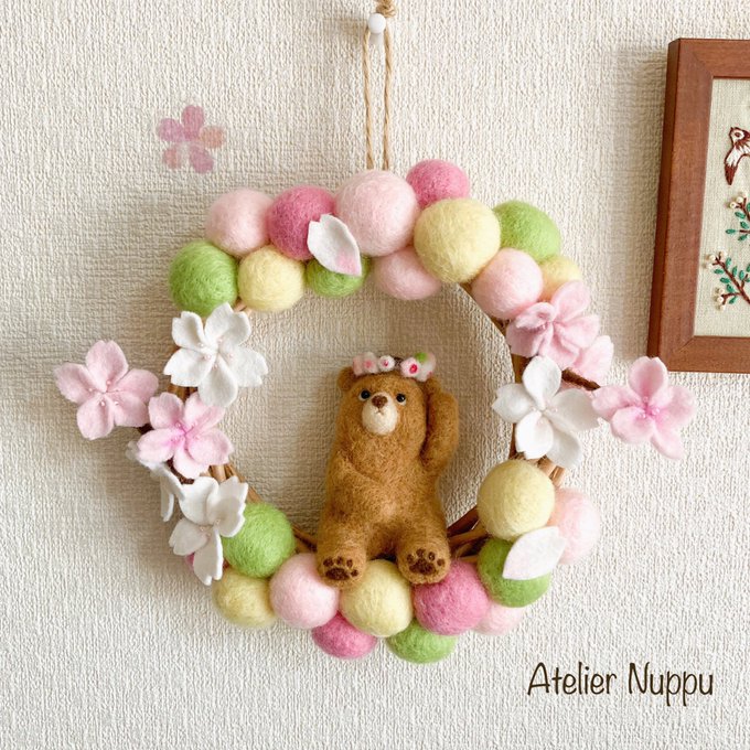 ・:*+. 新作 .:+ 桜とクマの春色リース🌸 桜を初めて見たクマのオリバー。 冠を気にしつつ、不思議そうに桜を見上げています。 〜〜〜〜〜〜〜〜〜〜〜 春色の濃いピンクの羊毛が廃番となりこの色のリースは最後になります😭 #羊毛フェルト #ハンドメイド #minne_new #TLを花でいっぱいにしよう