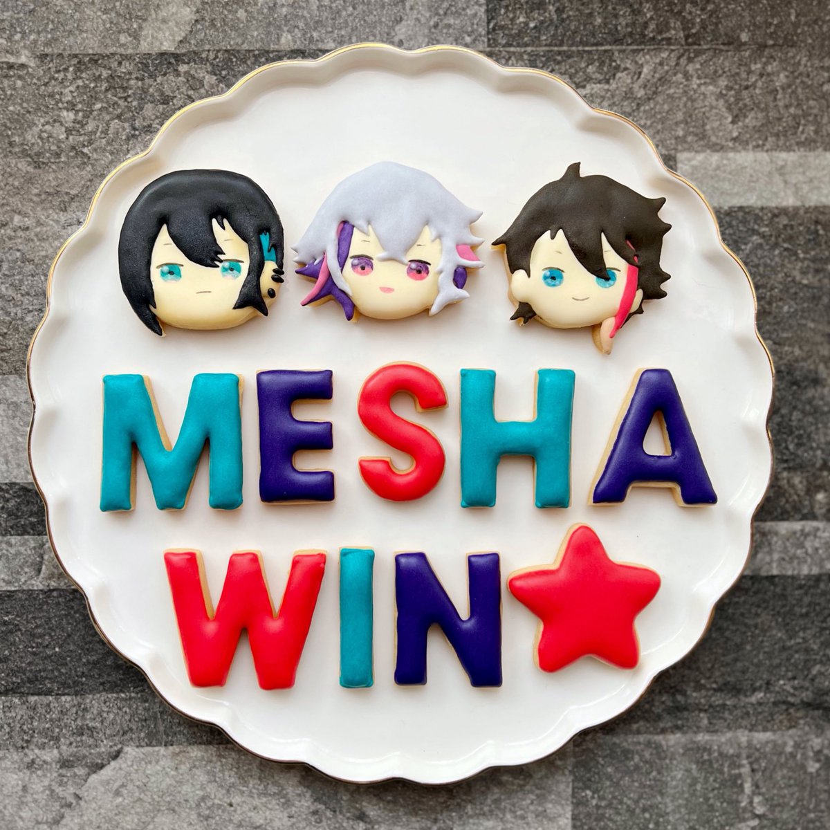 V最協決定戦もうすぐですね!仕事で観れないけど応援の気持ちだけ送ります!あとメシャ3人のアイシングクッキー作りました🍪頑張れ〜✊✊✊ #V最協S4 #飯屋WIN #さ絵ぐさ #絵スコート #灰画