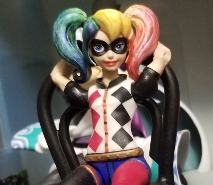 まさか #オモ写 タグ使うことになるとは… #リトルアーモリー に同じ種類のグレネードランチャーがあったので、それ組み立て、デカールシール自作して貼りました。弾込めシーンも再現できるぞ!手がそれ用に出来てないから粘着力弱めの両面テープで握ってもらった。 #HarleyQuinn #BirdsOfPrey