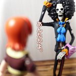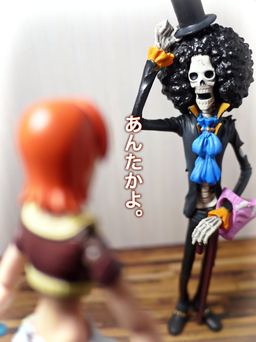 #夜のフィギュア撮影会 5/17お題 『人外』 麦わらの一味の人外チーム。 チョッパー「お前も改造人間ってことは俺たちの仲間だな、サンジ!」 サンジ「…」 #onepiece #tonytonychopper #animeheroes #franky #brook #ワンピーススタイリング