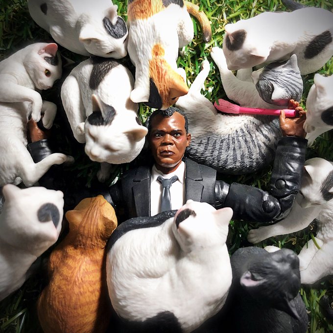 #夜のフィギュア撮影会 6/15 お題『湿』過去作 猫吸いをしようと思って猫の背中に顔をうずめたらしっとり湿ってた…お前、毛づくろい直後だったのか… #NickFury #CaptainMarvel #MarvelLegends #森口修の猫 #ガチャガチャ #カプセルトイ