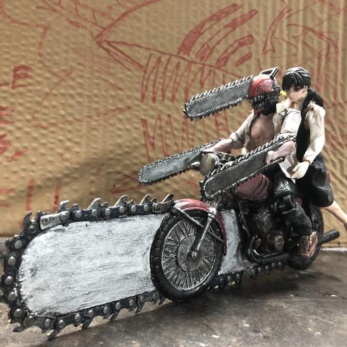 Super Chainsawman Motorcycle completed‼︎ スーパーチェンソーマンバイクが完成しました🤭 ベースはバイク屋さんの販促品の鋳物の置物のマッハ500、 チェンソー部分はハンドチェンソーの替え刃を加工して着けました 硬い素材の加工が辛かったです #チェンソーマン #chainsawman