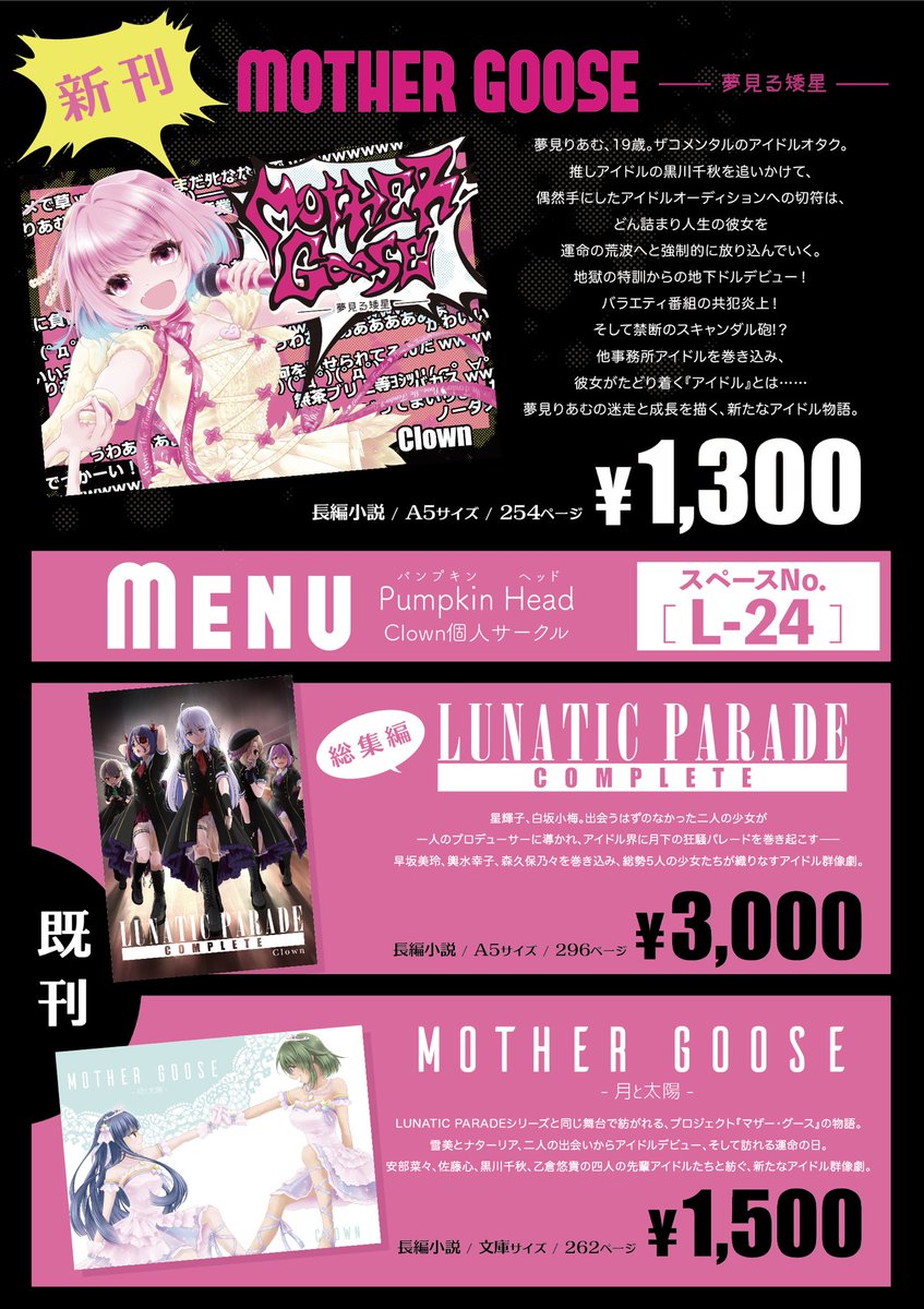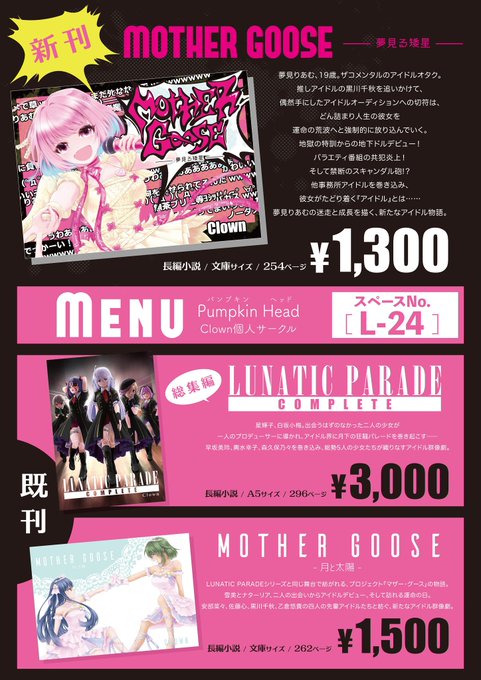 明日のシンステ10の宣伝を改めて。明日はブースL-24「Pumpkin Head」にて、夢見りあむ主役の新刊「MOTHER GOOSE-夢見る矮星-」他2冊を頒布します。いずれも読み応えのある長編小説です。概要をツリーに提げます。 #cin_stage #シンステ