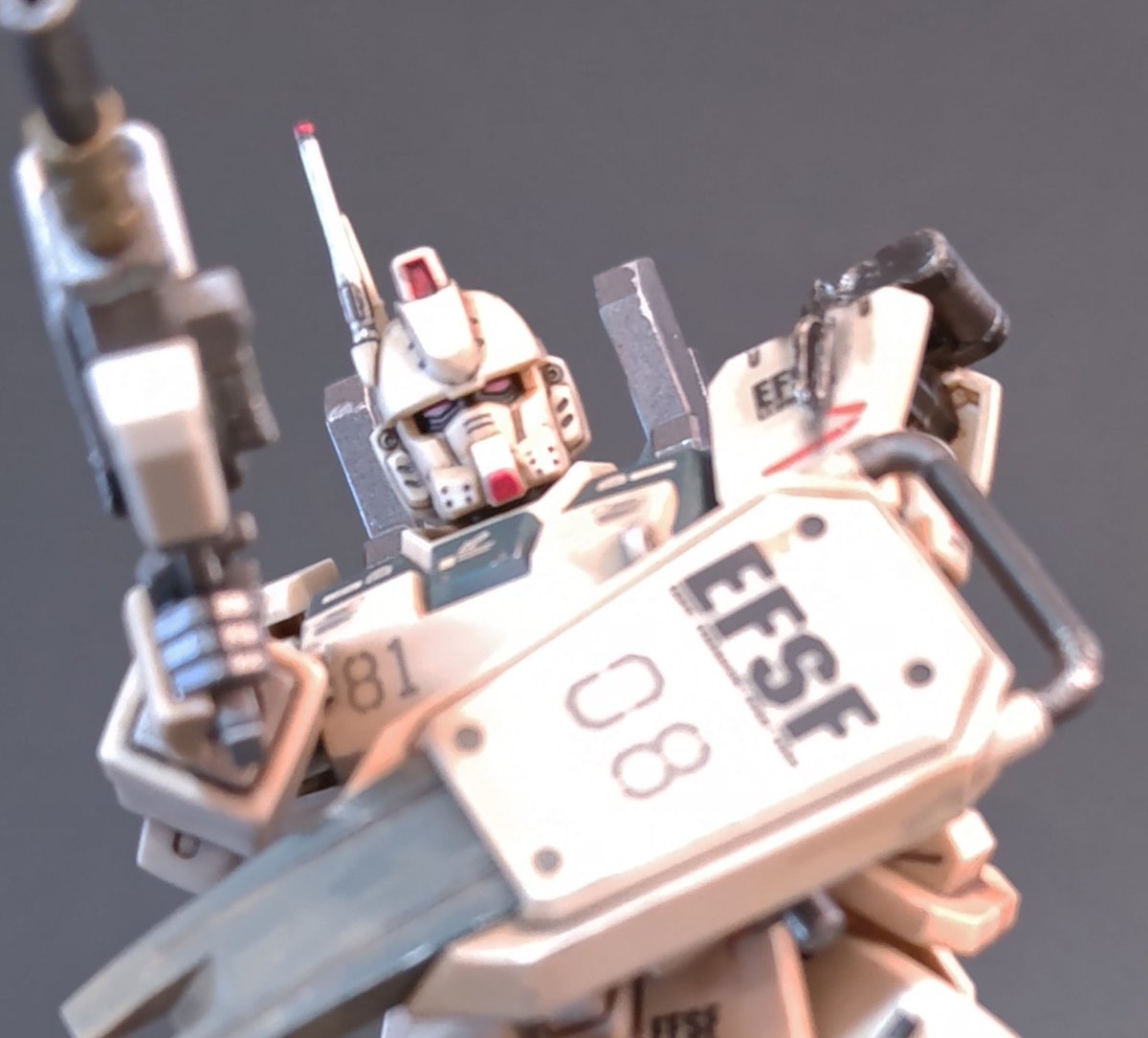 Ez8ウェザリング完了。 「三次元との戦い」でグフ・フライトタイプにヤラれた左肩がチャームポイントですw #ガンプラ #ガンプラの画像貼るとRTされると聞いて #ガンプラ好きと繋がりたい #Ez8