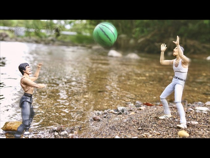 #おもちゃ撮影会 8/7 テーマ「夏休み恒例」 スイカ割り🍉 フレディ「李さん棒使ってー💦」 #オモ写 #toyphotography #FreddieMercury #BruceLee #スイカ割り