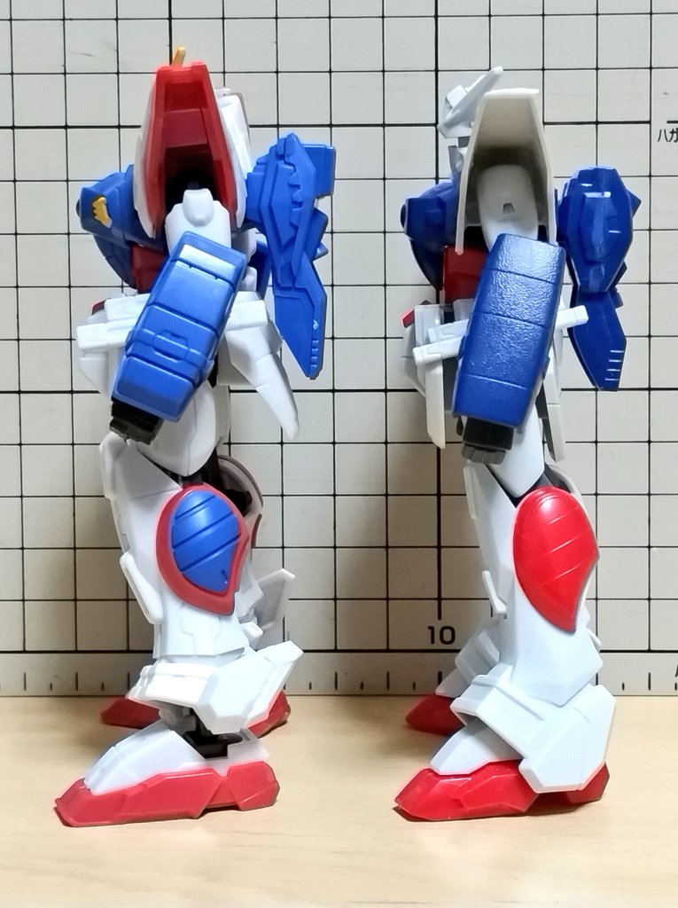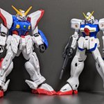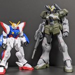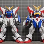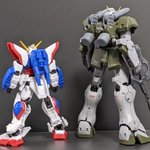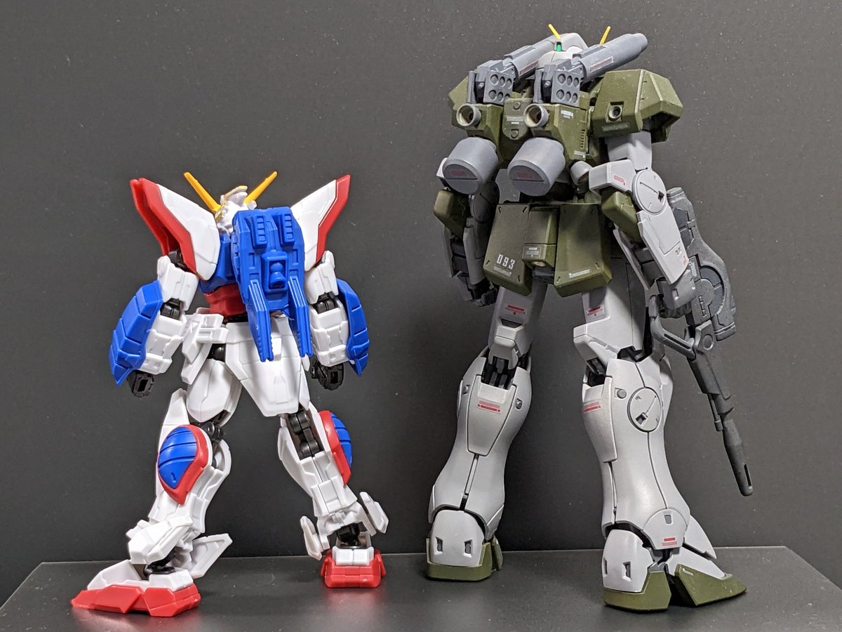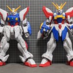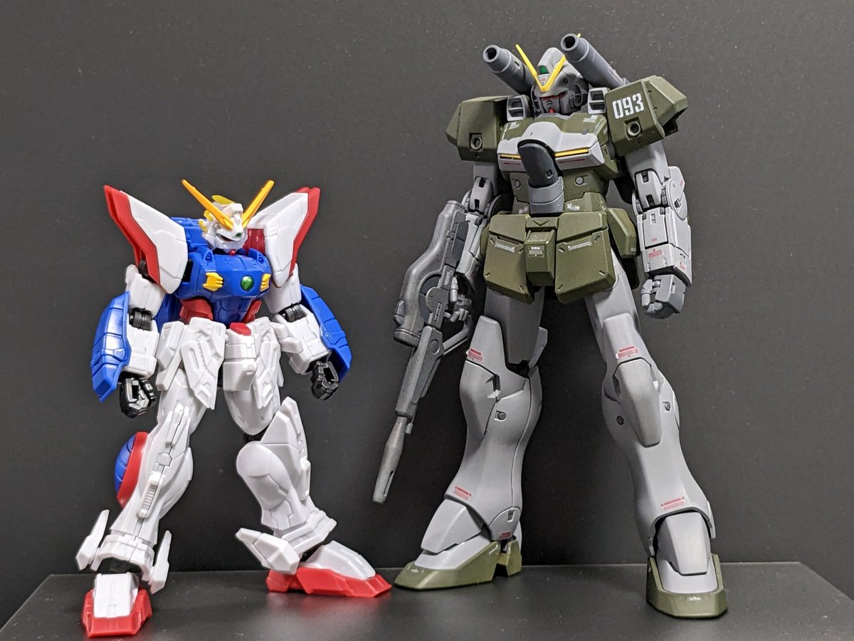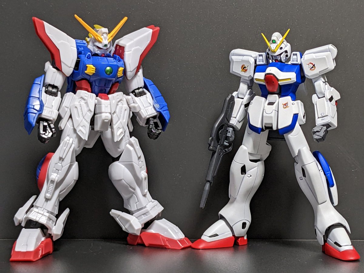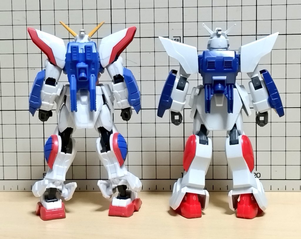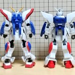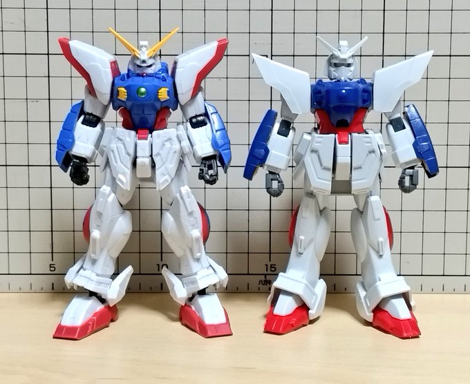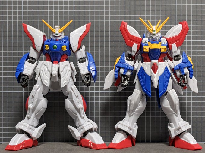 相互さんのツイートを見て気になったので、素組みのものと並べてみた! 向かって左がGフレームシャイニング、右が27年前の1995年発売の1/144シャイニング。 確かにほぼ同じサイズだ! #GフレームFA #シャイニングガンダム