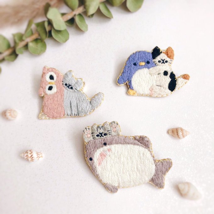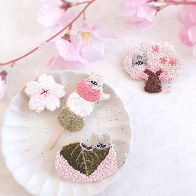 淡い桜の花のブローチと花よりもお団子が好きな猫のブローチのセットです🌸🐱🍡 桜が咲いた日に一緒にお散歩したくなる作品になりました♩ 【花より団子の猫の刺繍ブローチセット】 minne.com/items/31355483 #minne #minne_new #猫の日