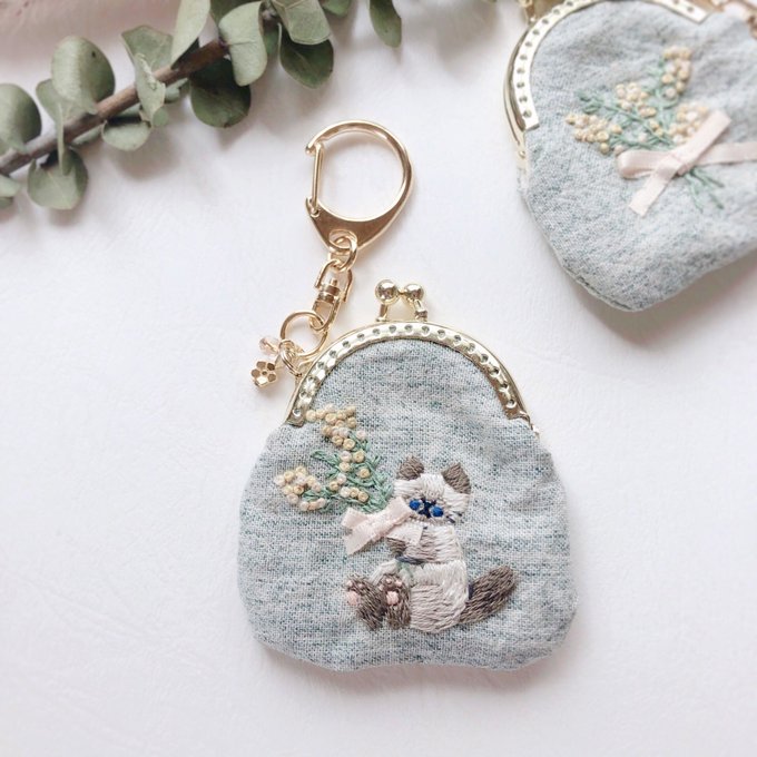 新作の刺繍がま口を販売開始いたしました🐱💐 ミニサイズのがま口は小銭やアクセサリー入れにぴったりです♩ キーホルダータイプなので鞄につけて持ち歩いてください👛 ミモザと猫の刺繍ミニがま口 minne.com/items/31743804 #minne_new