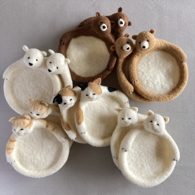 明日21時頃よりminneにて再販売予定の立体コースター達です☺️ ぽっちゃりクマ&猫 初孫のように可愛がっていただけたら嬉しいです(いなければ想像で)。 #羊毛フェルト #minne_new