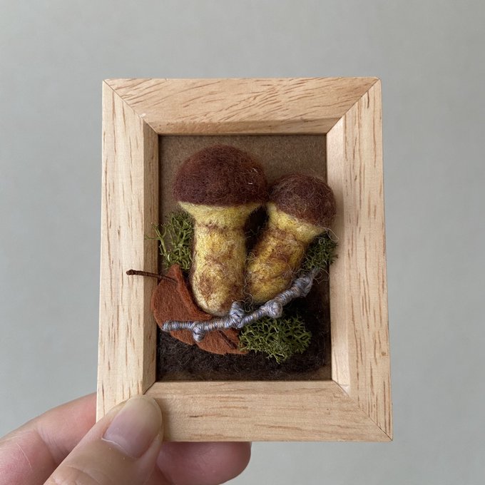 2 9 フェルトのきのこ #ハナイグチ のフレーム 双子の幼菌にしてみました。 #ひつじ草フェルト細工所 #羊毛フェルト #fungi #felt #mushrooms #ラクヨウ #ラクヨウキノコ 21/09/04 10:06