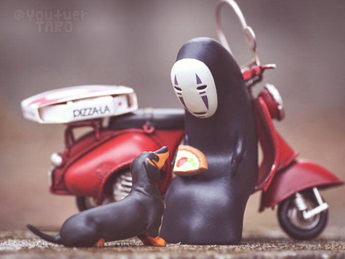 #おもちゃ撮影会 11/1 テーマ「犬 4」 食べたりなんかしないよ。ただ友達になりたいだけ。 #オモ写 #toyphotography #犬 #dog #カオナシ #ジブリ #千と千尋の神隠し #StudioGhibli #SpiritedAway #pizza