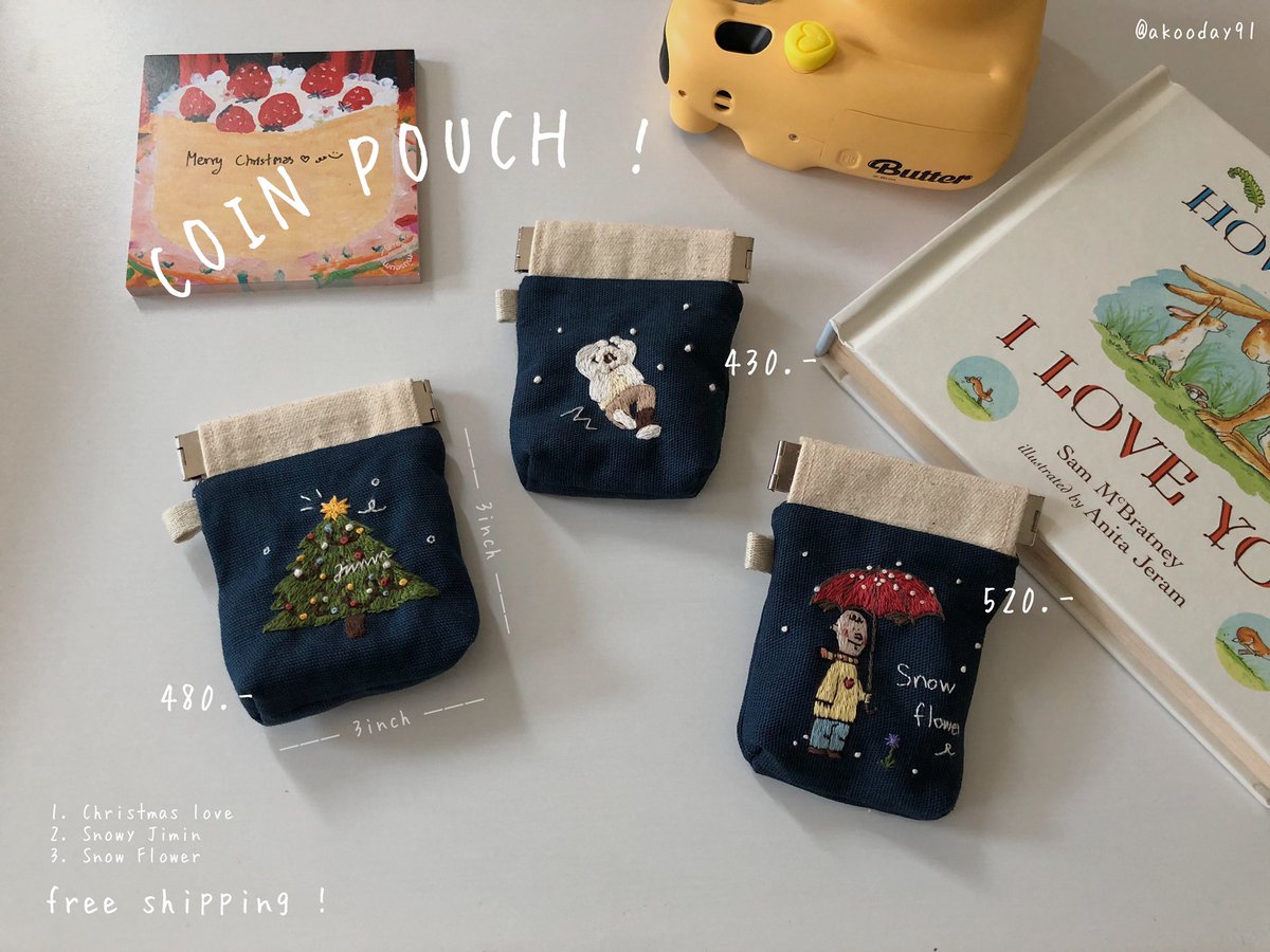[ please rt ] COIN POUCH 🧤ขนาด 3*3 นิ้ว พร้อมส่งอย่างละ 1 ใบ 1. Christmas love 480.- 2. Snowy Jimin 430.- 3. Snow flower 520.- เมนชั่นสั่งซื้อระบุหมายเลขได้เลยคับ 📦 ส่งฟรี ลทบ ทุกออร์เดอร์ *กระเป๋าจัดส่งไม่เกินวันพุธ ♡ #BTS #JIMIN #TAEHYUNG #V #ตลาดนัดบังทัน #btsfanart