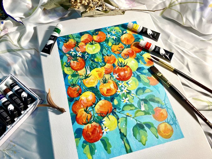 #วาดรูป มะเขือเทศบนเฟรมผ้าใบ ครั้งแรก! หลายคนคงเห็นภาพมะเขือเทศนี้ที่เราวาดไปแล้ว เดี๋ยวจะมาเล่าให้ฟังถึงกระบวนการวาดและสีที่ใช้ว่ามีอะไร ยังไงบ้าง #สีอะคริลิค