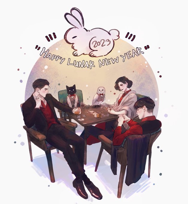 #องค์กรไสยวิบัติ วาดวันตรุษจีนย้อนหลังค่ะคุณ! AU เจ้าแม่เซี่ยงไฮ้อีกแล้ว หวังว่าเจ้าแม่จะจีบโจรหล่อสำเร็จสักทีนะคะ😂 ปีนี้มาในธีมอบายมุขแต่วงไพ่ขาไม่ครบเลยต้องรบกวนคุณปี ส่วนคุณอะนันเป็นคนแจกไพ่คับ (...) //ในแก้วคุณปีเป็นโคล่านะคะ จุ้มุ้ 🤏🥹
