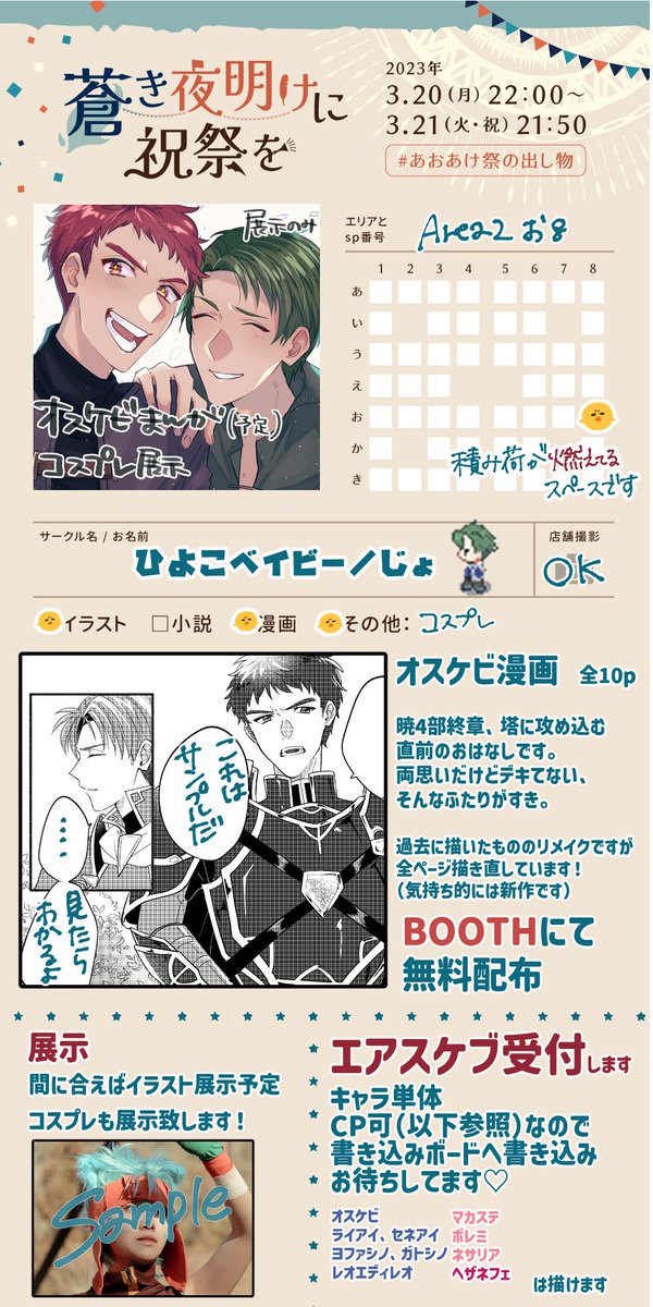 3/20~21開催の「蒼き夜明けに祝祭を」様にティバペレで参加します!サークルカット&お品書きです。漫画ですが、出来たとこまでポイピクにUPしたいと思います✒️💨当日をお楽しみに😌 #あおあけ祭の出し物