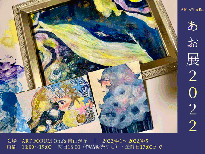 【展示のお知らせ】 #ARTsLABo あお展2022にATC2点、額装1点で参加いたします。 メインの額装は久しぶりにがっつりアクリルで描きました。よろしくお願いいたします🐳✨ 2022/4/1~4/5 ART FORUM One's自由が丘 詳細 creatorsbank.com/ARTs_LABo/even… #あお展2022