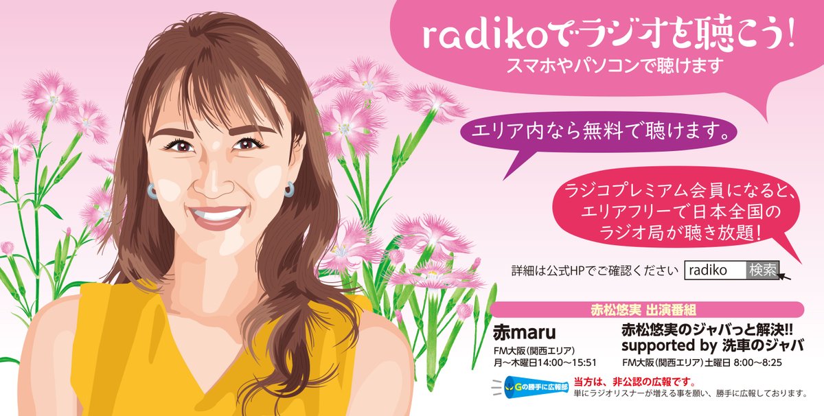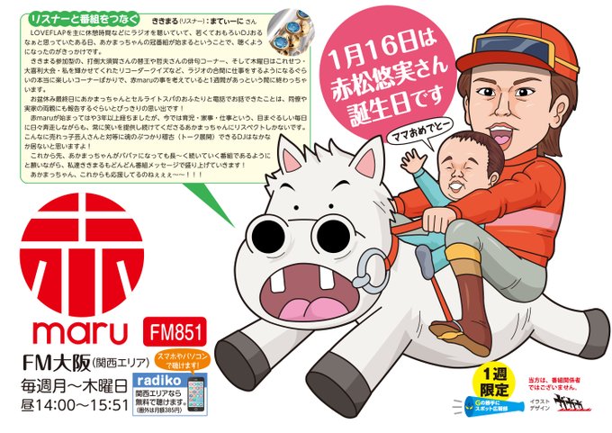 1週早いスポット広報(1回限定)…なぜ今日にしたかと言うと、本日赤松さんの誕生日だからです😄。おめでとー🎊👏 FM大阪「赤maru」を勝手に広報中。ききまるのまてぃーにさんに文章をお願いしました。感謝です😊。「いいね」やリツイートくださると助かります🙏。 #あかまる #絵描きさんと繋がりたい