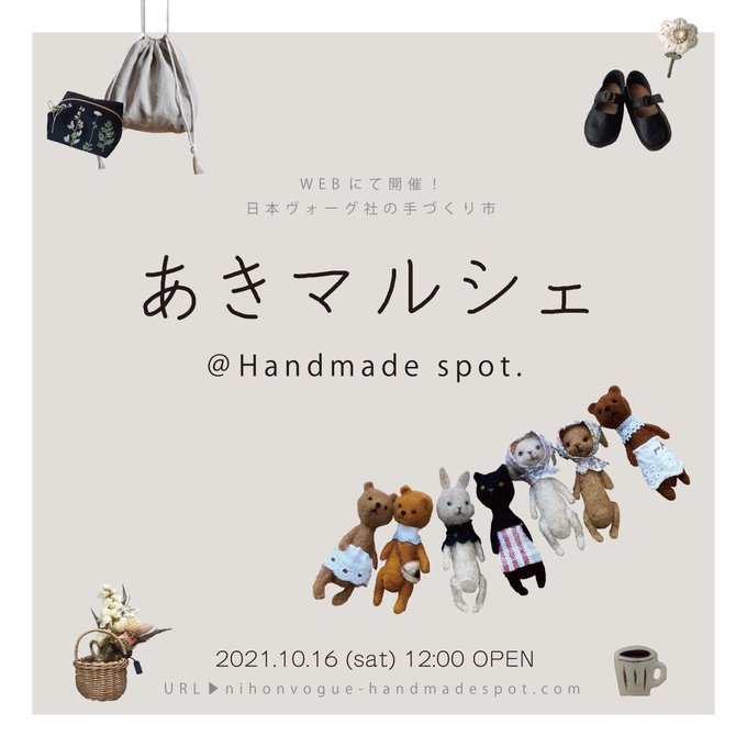 【オンライン販売のお知らせ】 #handmadespot 日本ヴォーグ社主催 #あきマルシェ vol.02 》start《 ◽️11.12(sat)2022 ◽️ONLINE 12:00 pm OPEN ◽️URL:nihonvogue-handmadespot.com @_handmadespot ※全て未接着で粘着剤で仮止めしています。