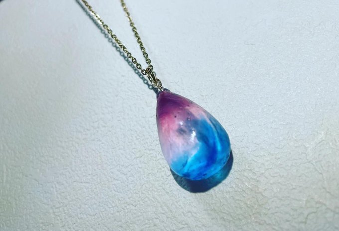 もっと綺麗に写真を撮ることが出来たので再upします。 昨日投稿した #あくありうむ。のアクセサリーをネックレスにしました。 金の金具との相性が最高です。 #あくあーと twitter.com/soleil_ssbu/st…