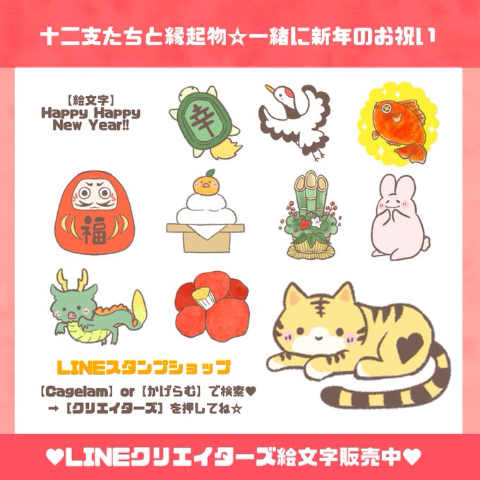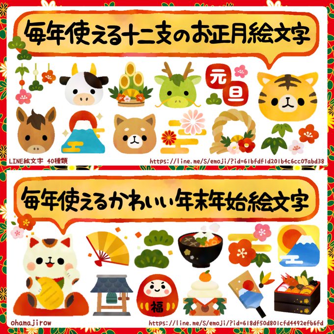 LINE絵文字2種類リリースしました‼️😃 あけおめスタンプキャンペーン対象絵文字です🎍 🌸毎年使える十二支のお正月絵文字 line.me/S/emoji/?id=61… 🌸毎年使えるかわいい年末年始絵文字 line.me/S/emoji/?id=61… よろしくお願いします☺️ #あけおめスタンプ告知コンテスト #あけおめスタンプ2022