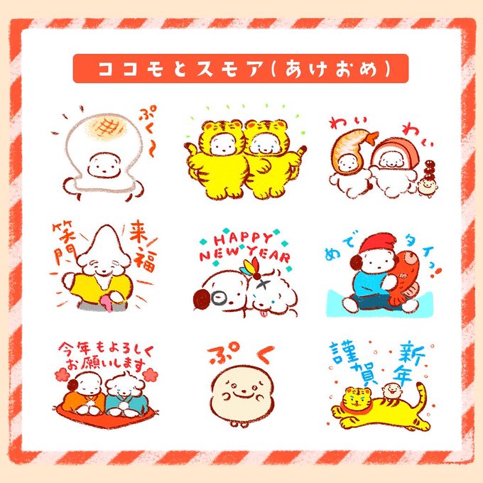 ココモとスモアのあけおめスタンプがリリースされました🐶🍊 お正月にはもちろん、年末年始や冬の間にピッタリ、ぬくぬくです!ぜひチェックして頂けますと嬉しいです〜!❄︎ ⚪︎line.me/S/sticker/1776… #あけおめスタンプ2022