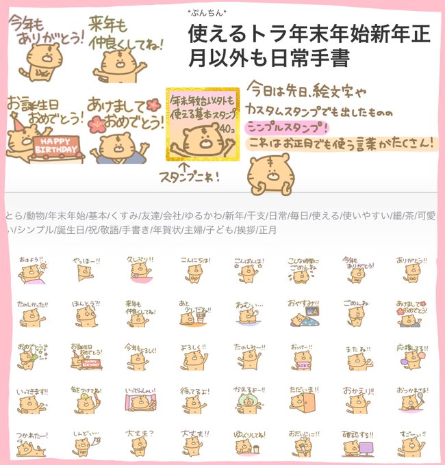 #LINEスタンプ 「トラさん正月&日常」販売開始!🎍✨ #冬 #年末年始 に使いやすいスタンプでございます😊 そしてなんと!LINE公式の #あけおめスタンプ2022 干支編🐅のアイコンに!う、嬉しい😭 store.line.me/stickershop/pr… #あけおめスタンプ告知コンテスト #寅年 #寅イラスト #寅キャラ #イラスト