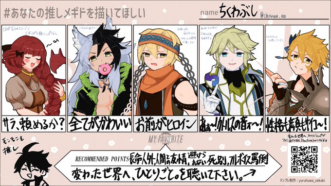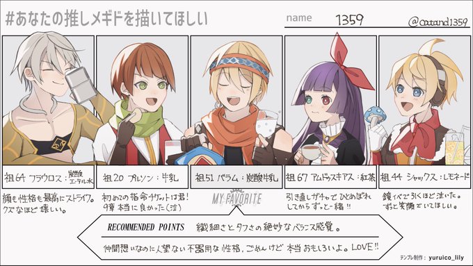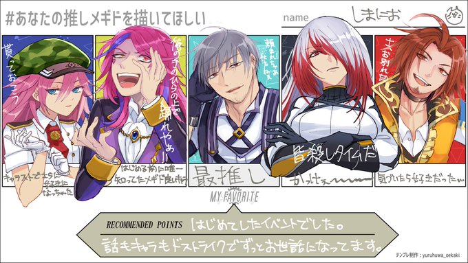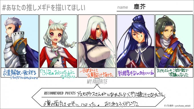 #あなたの推しメギドを描いてほしい 5周年目前なので改めて 描いたのは5人ですが正直収まっていません あと10回くらいやる必要があると思いました 追伸:勝手にMY favouriteを増やしてすみません