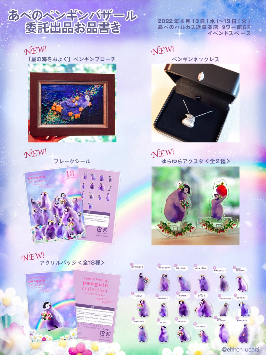 お品書き出来ました〜!今回は新作多めです🐧🌟🍓🌼 ぜひ #あべのペンギンバザール でお気に入りの子をゲットしてくださいね♫再販などのアイテムは↓に続きます! #ペンギン #イラスト #penguin #illustration