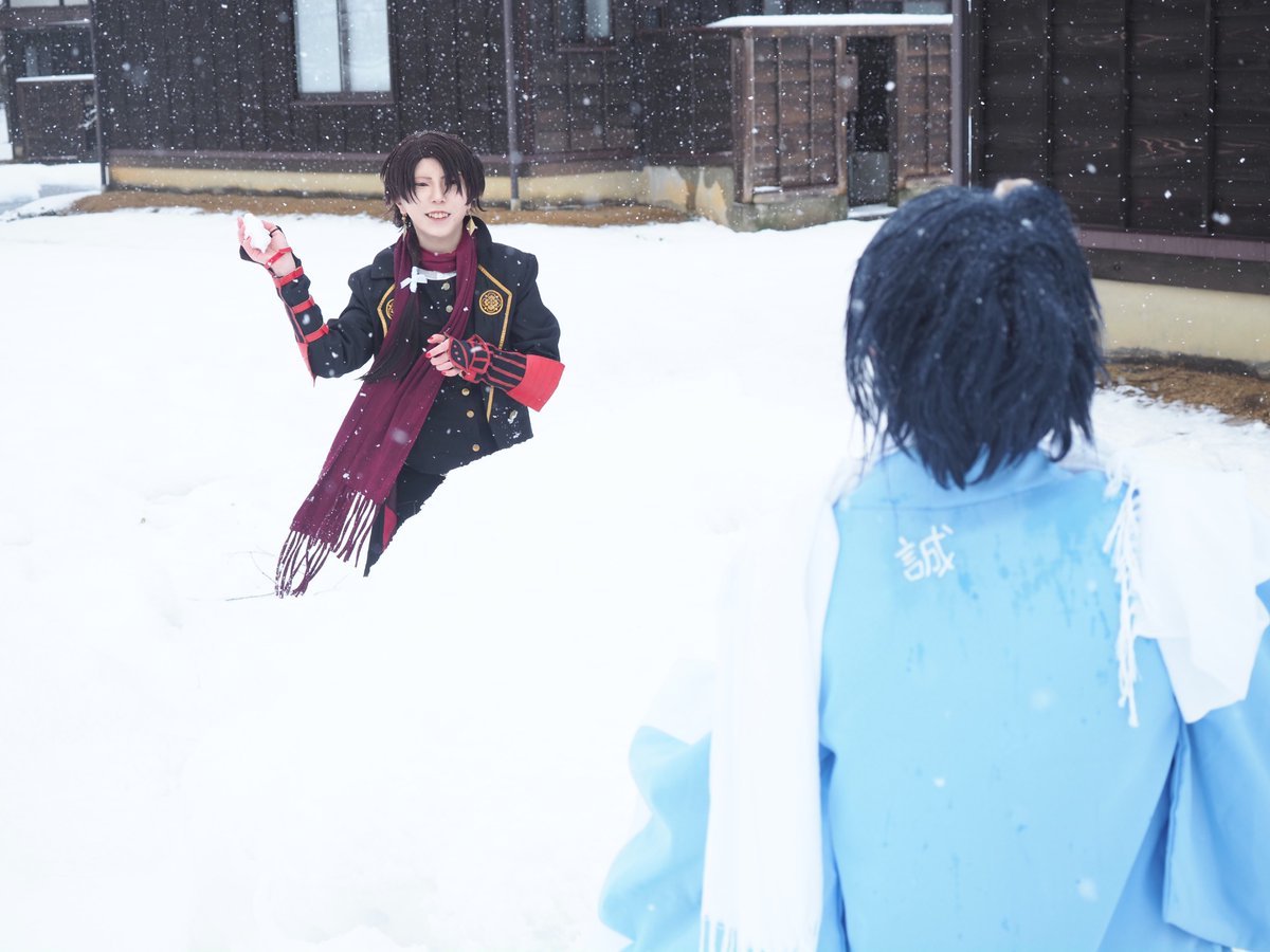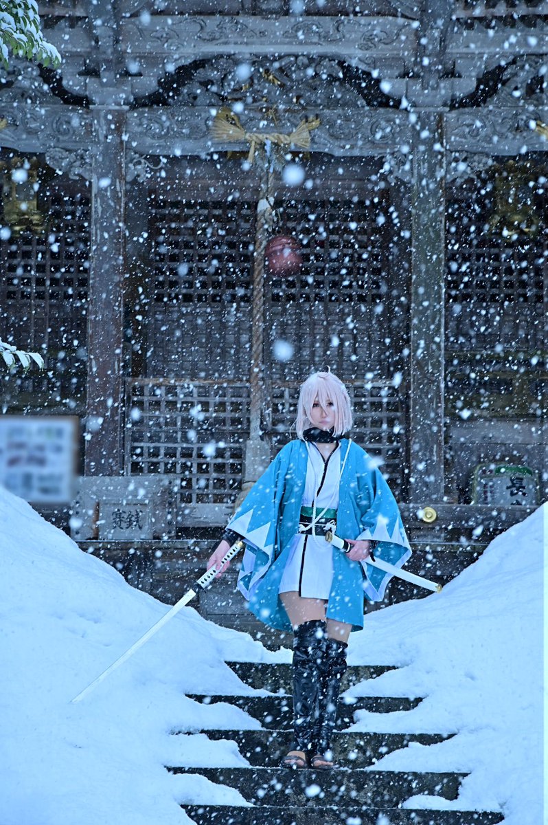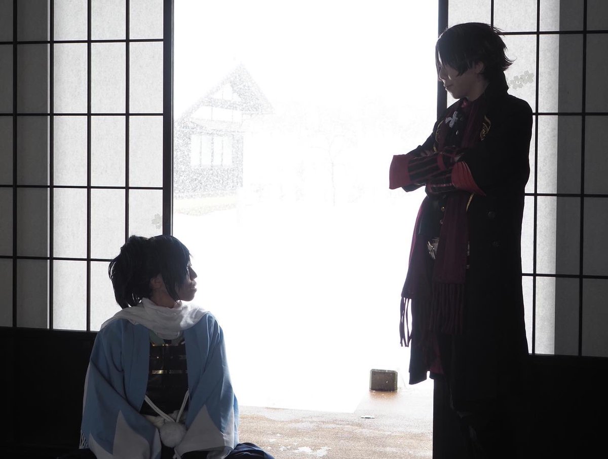#あまりにも暑いので真冬のコスプレ写真を眺めて涼みたい 沖田組 ⚠️Cosplay⚠️ 載せてるかもしれないけどw 縁側から外が白いのは降雪の影響で真っ白になってます (吹雪いたらホワイトアウトになる降り方) 大和守安定 まきせさん @Makise_touken 📸巧郎さん@C35703430 ロケ地撮影許可済