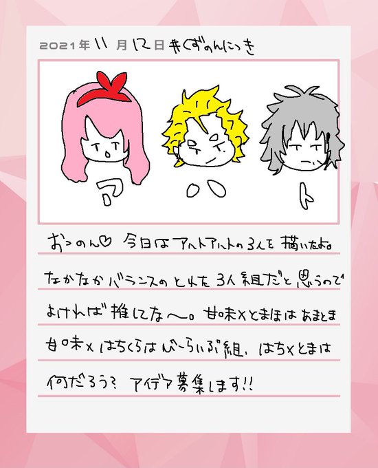 本日の #くずのんにっき #アハトアハト の3人を描きましたよ🎀🐝🤖 きじゅなで結ばれてるから仲良しなんだぜ✌️ だからこのクオリティで描いても怒られない…はず😓 #HachikurArt #Tomahawk_Art #あま見所
