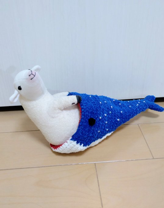 🐏「ぎゃー」 #六甲山牧場 #羊の毛刈りぬいぐるみ #あみぐるみが編みたくなる糸 #圧倒的B級サメ映画 #ジンベエザメは羊食べません 怜惟さん(@reirei3413)の編み図参考にさせていただきました✨怜惟さんのジンベイザメは凄いカワイイんです!出来心で魔改造してしまいました…