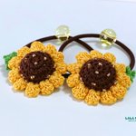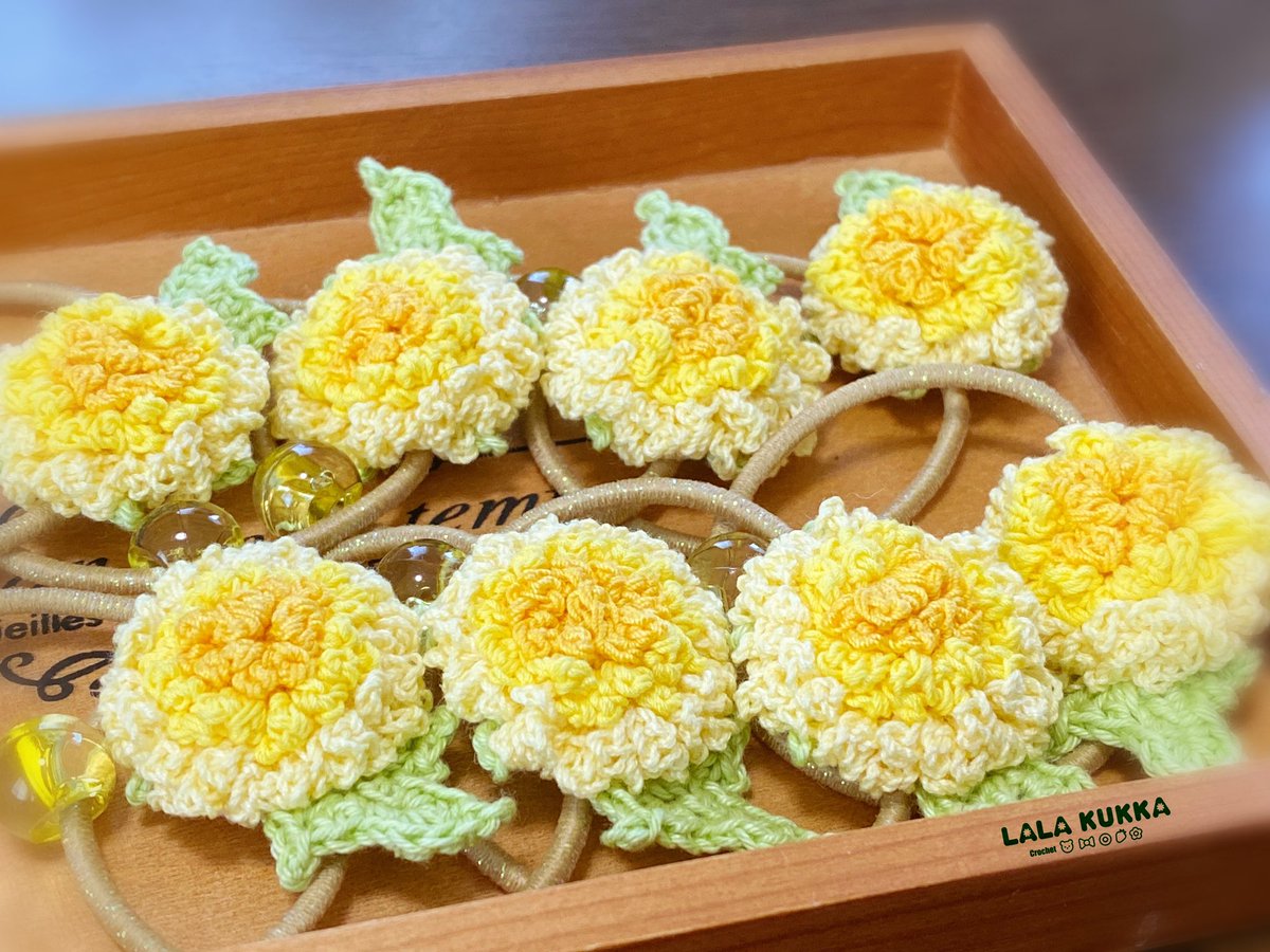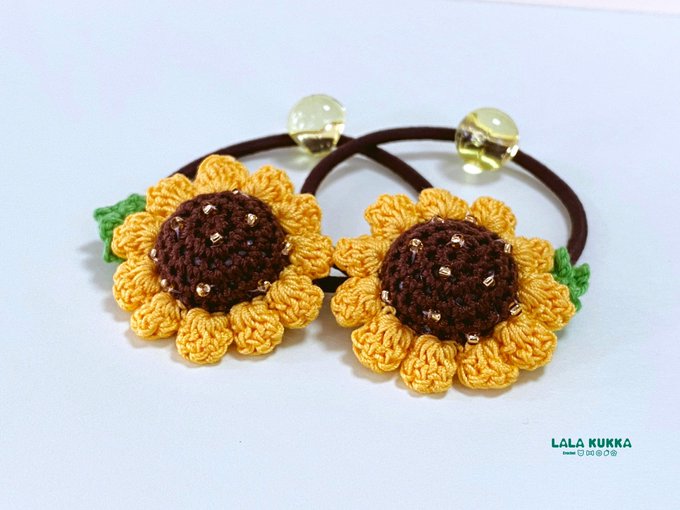 今年のヒマワリヘアゴムは、これでいきまーす🌻 昨年とゴムの色とビーズが変わっています✨ 🌻葉っぱ左上ver. minne.com/items/627938 🌻葉っぱ右上ver. minne.com/items/19209446 (画像はまだ昨年のままです) #minne #かぎ針編み #あみぐるみ #あみぐるみヘアゴム #ひまわり #向日葵