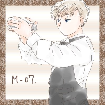 7.バーテンダー #苑辺野文化部 越智 岳久。 描いた当初 「『あるよー』って言ってほしい」と懐かしいネタを振られましたね😊 黙々とシェーカー振ってそう。 持ち方めっちゃ調べた… でも未成年だから中身はジュースで。 カマーベストってイイですよね…🥰 #ありがちコスプレ40