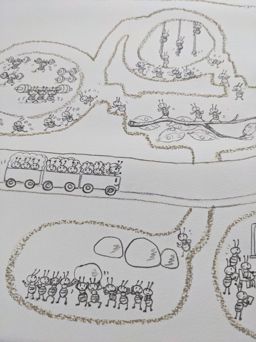 ありんこトロッコ 原画制作風景の一枚 キャンソンモンヴァル紙に 色鉛筆でありんこさん達を描きます。 ありんこの巣と土の部分の境目はクーピーペンシルとクレヨン。 この後水張りして水彩絵の具で着彩します。 #イラスト好きさんと繋がりたい #イラスト #illustration #絵本 #ありんこトロッコ