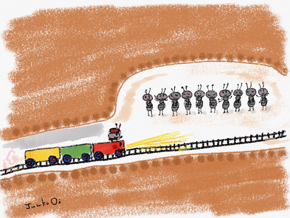 トロッコ トロッコ ありんこトロッコ ごと ごと ごと にこにこしょてんえき とうちゃくでーす ありんこに きょうみのあるかたは こちらへ ぜひ およりくださーい #イラスト好きさんと繋がりたい #イラスト #illustration #ありんこトロッコ #アリス館