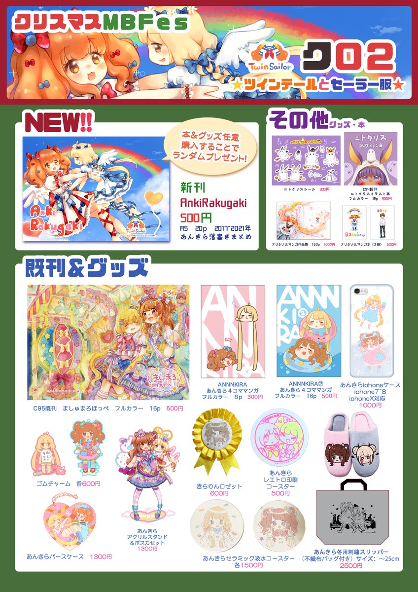 皆さんこんにちは!! クリスマスMBFesに参加します~!~! お品書きはこちらです!ほぼ既刊になりますが新刊はこの数年あんきらの落書きをまとめた本となります。今回の新刊は最後のあんきら本になりますのでもしよければ遊びに来てくださいね^^ 詳細:twintailsailor.tumblr.com/post/671109838… #MBFes #あんきら
