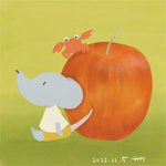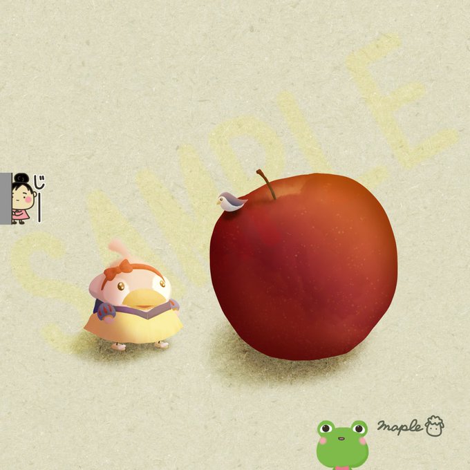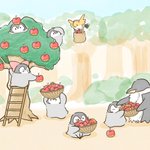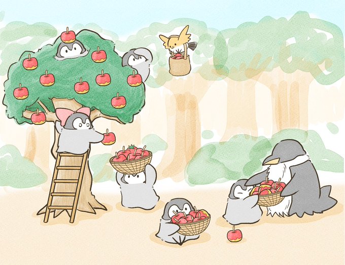りんご狩りを楽しむぺんちゃん✨ 苦手なトマトが混じっている事には、ちゃんと気付くかな?🐧 昨日は #いいりんごの日🍎 #イラスト #illustration #ゆるいイラスト #みんなで楽しむTwitter展覧会
