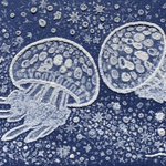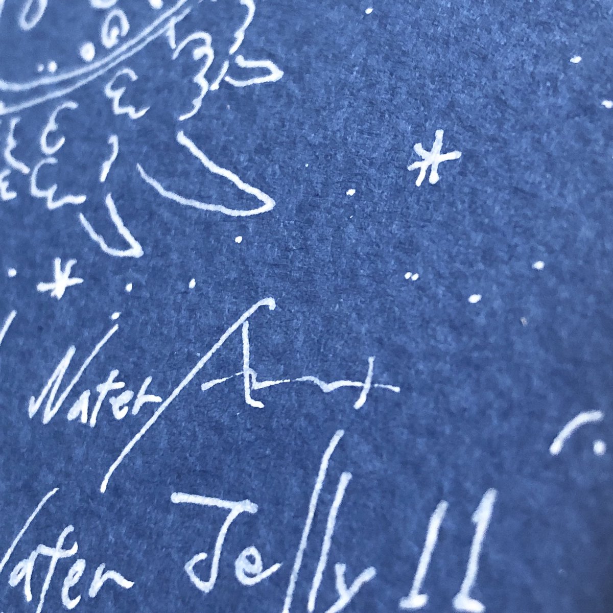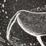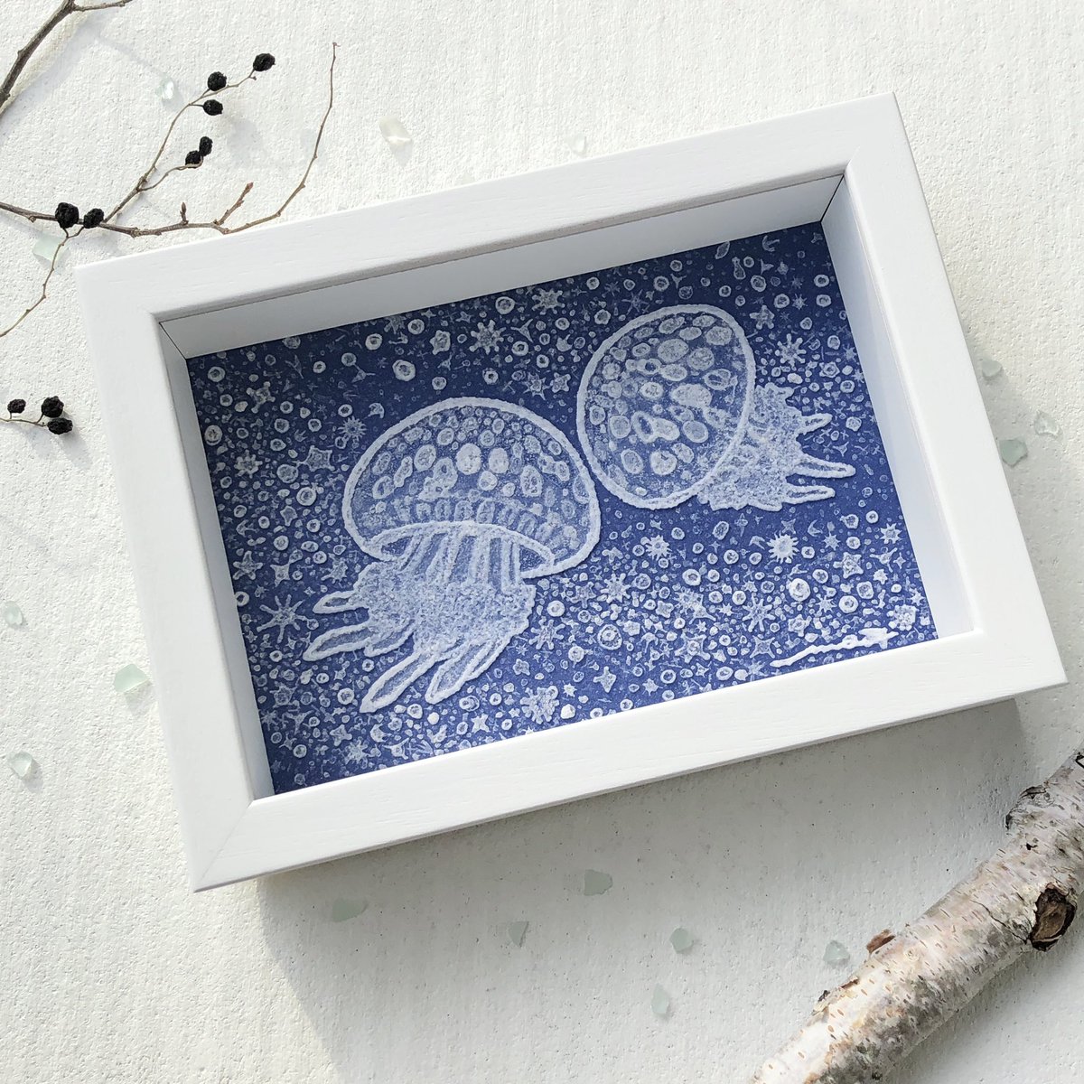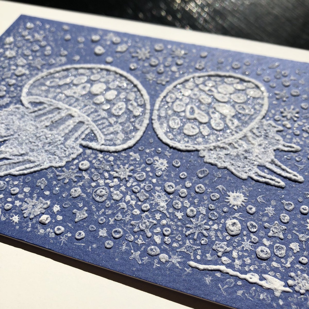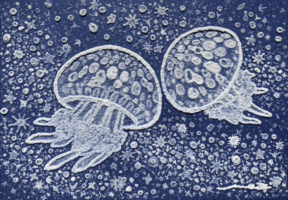 新作 #塩水アート 小作品 「Salt Water Jelly11」 タコクラゲがモチーフ 8本の付属器(口腕から伸びる、タコの足のようなもの)が名前の由来🐙 褐虫藻を体内に共生させているため光合成でも栄養が摂れるそう まだ幼さが残る2匹が寄り添うような構図にしました🤝 #いきもにあ2021 #いえもにあ2