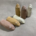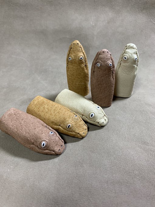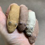【アラビアサンドボアの指ぬき】 別名ホシニラミスナボア Eryx jayakari アラビア半島の砂漠に生息する小型のヘビ。 夜行性で昼は砂の中に身を隠す。 目が上向きについた独特の顔つきが忘れられない。このやる気の無さよ…! #いきもにあ2021 素材はピッグスエード、3色、表情は色々。