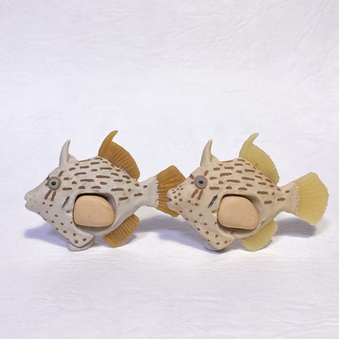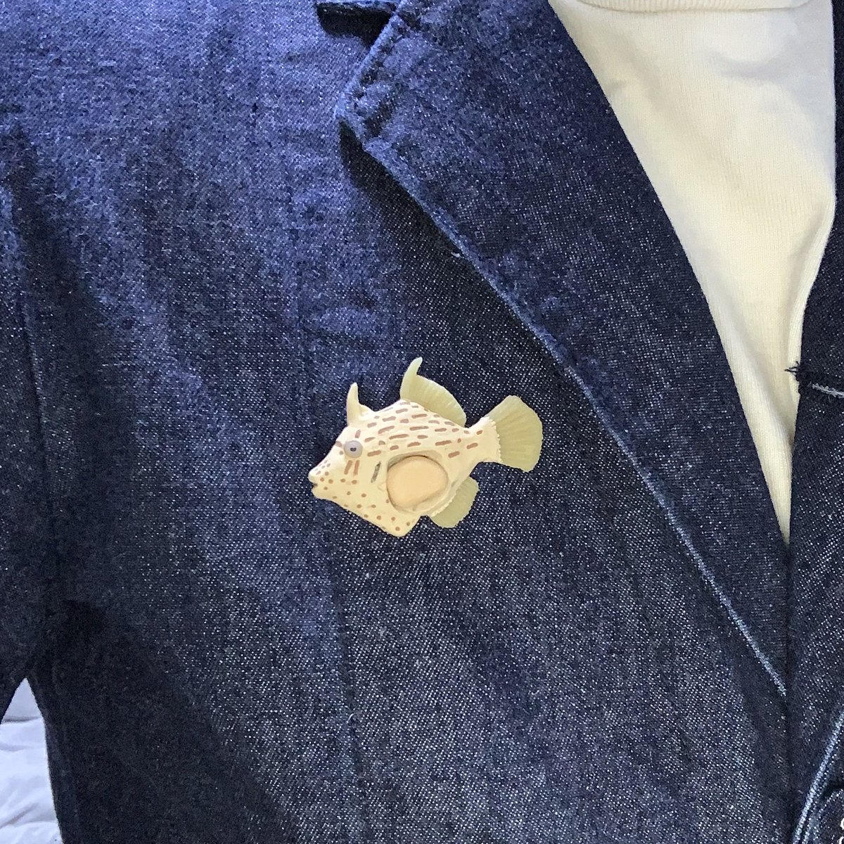 これも新モノ『カワハギと肝のブローチセット』 肝を食べたい気持ちがなぜかこうなりました。 カワハギと肝は取り外しできるので、セットでつけて肝を見せびらかしたり、別々でつけてみたり…楽しみ方いろいろです。 週末12/4より開催の #いきもにあ2021 にて販売予定。