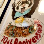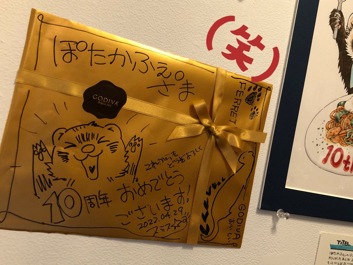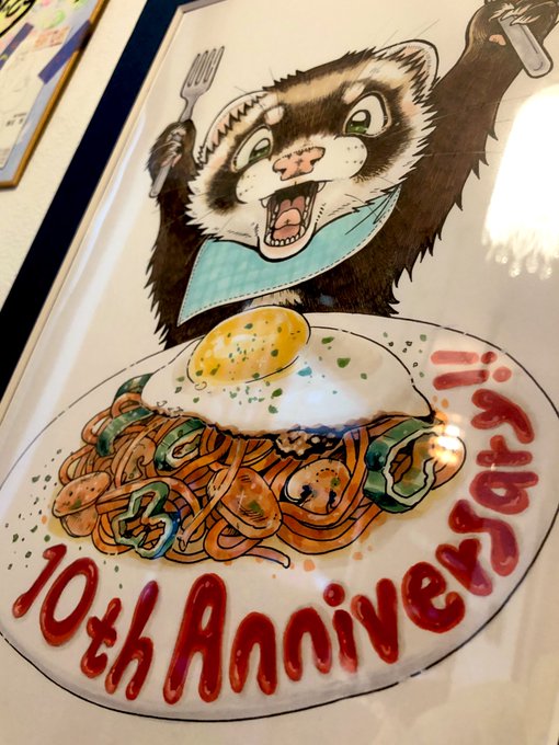 そんなわけで5月3日まで『ぽたかふぇ。の10周年。』が開催中‼️たくさんの作家さんのお祝い絵がずらっと並んで見応え抜群🎨 私もお祝いに一枚描かせていただきました♫(非売品)店長のおうちのくうぞぅちゃんがモデル💕 本日よりもう一枚… この金ぴかアートも展示してくださってます🤣#いたちっち twitter.com/pottercafe/sta…