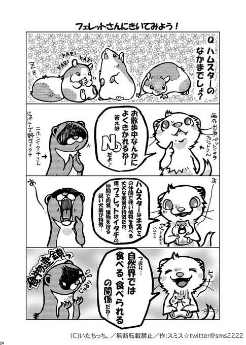 【フェレットはいたちか!③】 「#フェレット さんて何を食べるの?」 フェレットのごはんってなんでしょ? 前回は「大きな括りで言うとハムスターさんとは被食・捕食の関係」というお話でしたが…まさか?! #ニホンイタチ #いたちっちのフェレット漫画 #いたちっち。 #漫画が読めるハッシュタグ