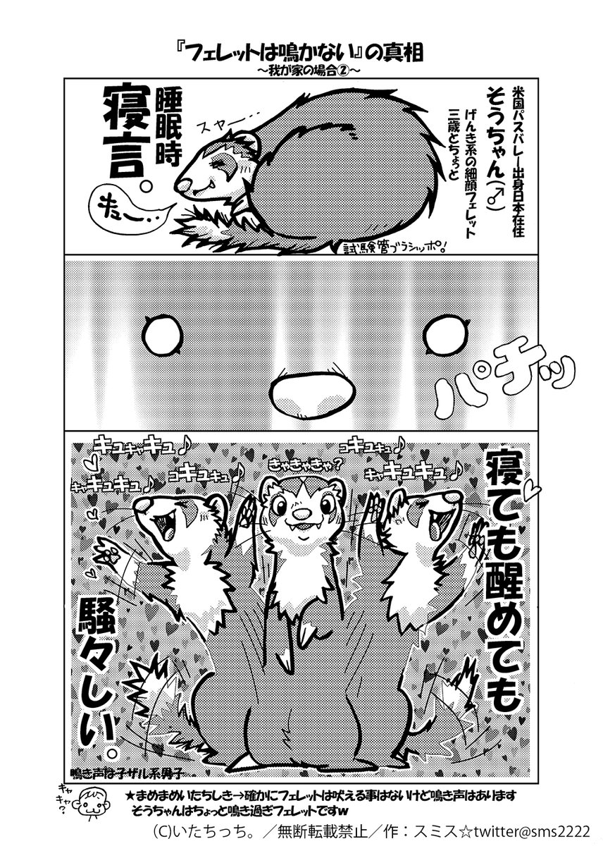 【フェレットはいたちか!⑤】 さぁ〜〜て!今週の #フェレット ちゃんは〜!? 「鳴かないからマンションでも飼いやすいですよっ!」 ってよく聞くけど本当にそうかなぁ?🤔 わが家のパスバレーファームボーイズの場合は… #いたちっちのフェレット漫画 #いたちっち。 #漫画が読めるハッシュタグ