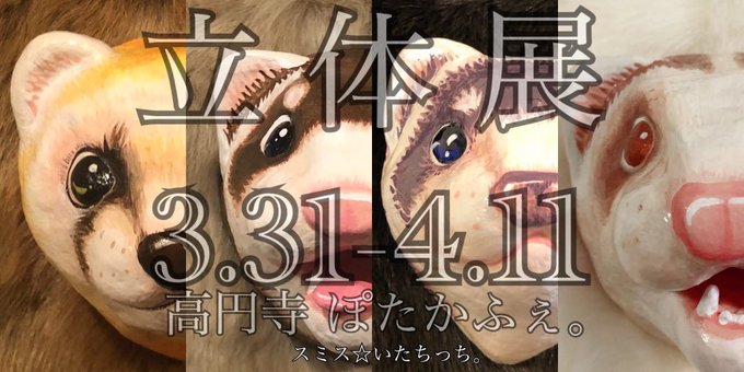さぁ「#立体展」始まりました🐾 開店からギャラリーは賑わっておりますよ〜!! わたくしは作家活動では初の立体作品で挑みます‼️ # 1 ホンドテン # 2セーブル # 3 シルバー # 4 シャンパン お触りはNGですがぜひいろんな角度から眺めてください💕 会期中よろしくお願いします✨ #いたちっち。 twitter.com/sms2222/status…