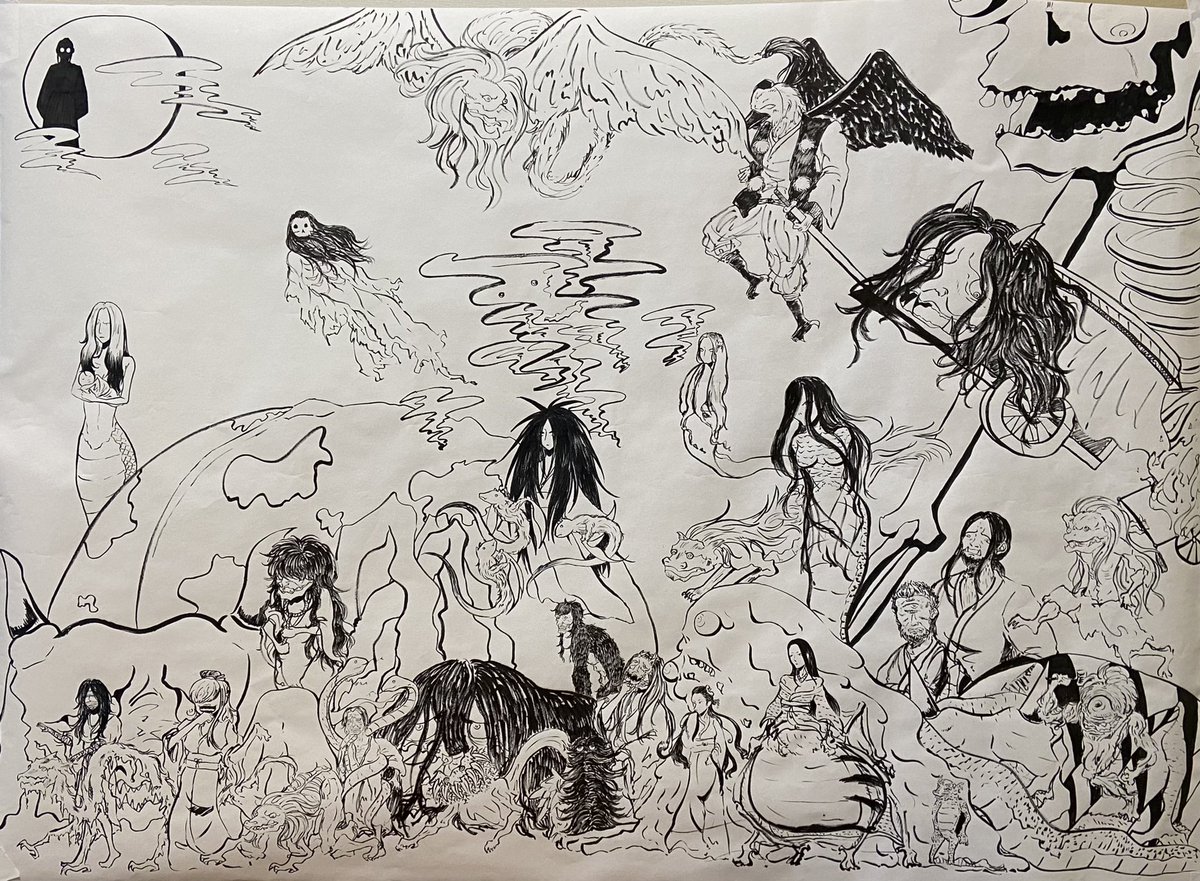 模造紙にいっぱい妖怪を描く遊びが終わりました。 思ったよりごちゃごちゃしましたね。 模造紙を埋めていくのめっちゃ楽しい。 〇〇が〇〇に見えないとかはなしでお願いします🙏 #いち #イラスト #妖怪 #筆ペン #百鬼夜行 #イラスト好きな人とつながりたい #イラスト好きさんとつながりたい