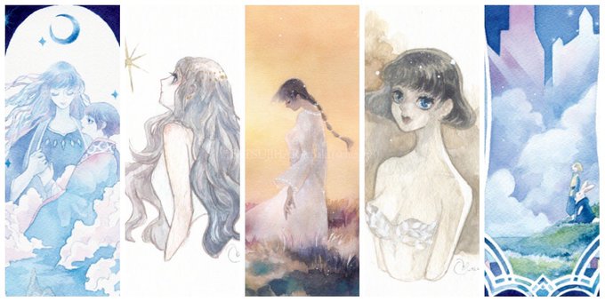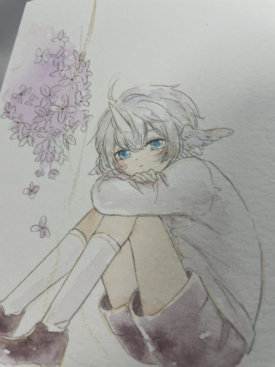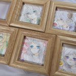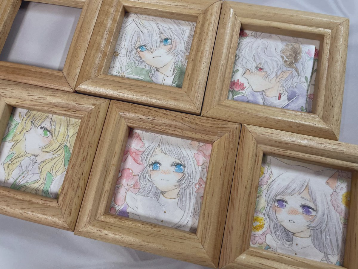 #いつかの話どこかの記憶 額装作品4点のほか、ミニ額原画は花言葉に「思い出」が入るお花で5点描きました🌷 (みんな目線がこっちにないのはどこかの記憶へと想いを馳せているから…かも😌✨) ドローイング2点はシエルと幼リオで、ライラックの花言葉も「思い出」です