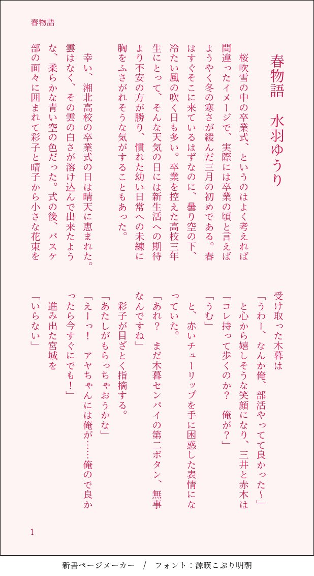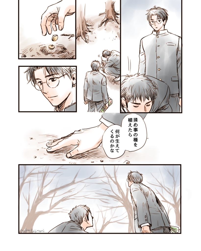 #いつでも三暮まつり 「春物語」 何年も前に水羽さんの小説の一部を漫画にしたことがあったのですが、あまりにも古いので絵をなぞりながら描き直してみました。卒業シーズンということで。卒業してほしくないけど…😭 漫画3p、元になった小説5p、最後に描き下ろし1枚です。