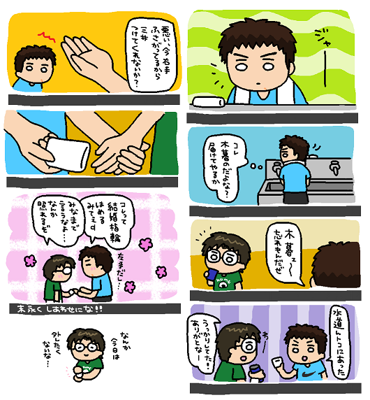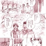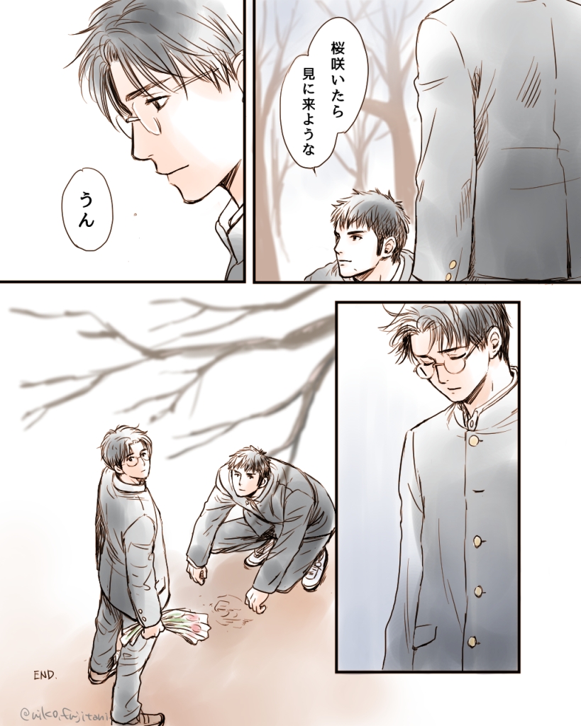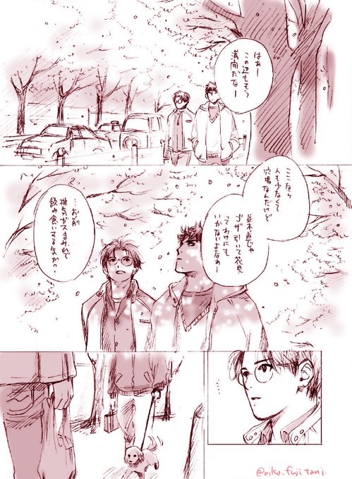 桜の時期を逃すと載せられなくなるので再放送します。 太古の昔に描いた大学生三暮(ネームだけ描いてスキャンしただけ)です。(全7p) サイズ変えて当時より少し見やすくしたつもりですが見にくかったらすみません; #いつでも三暮まつり